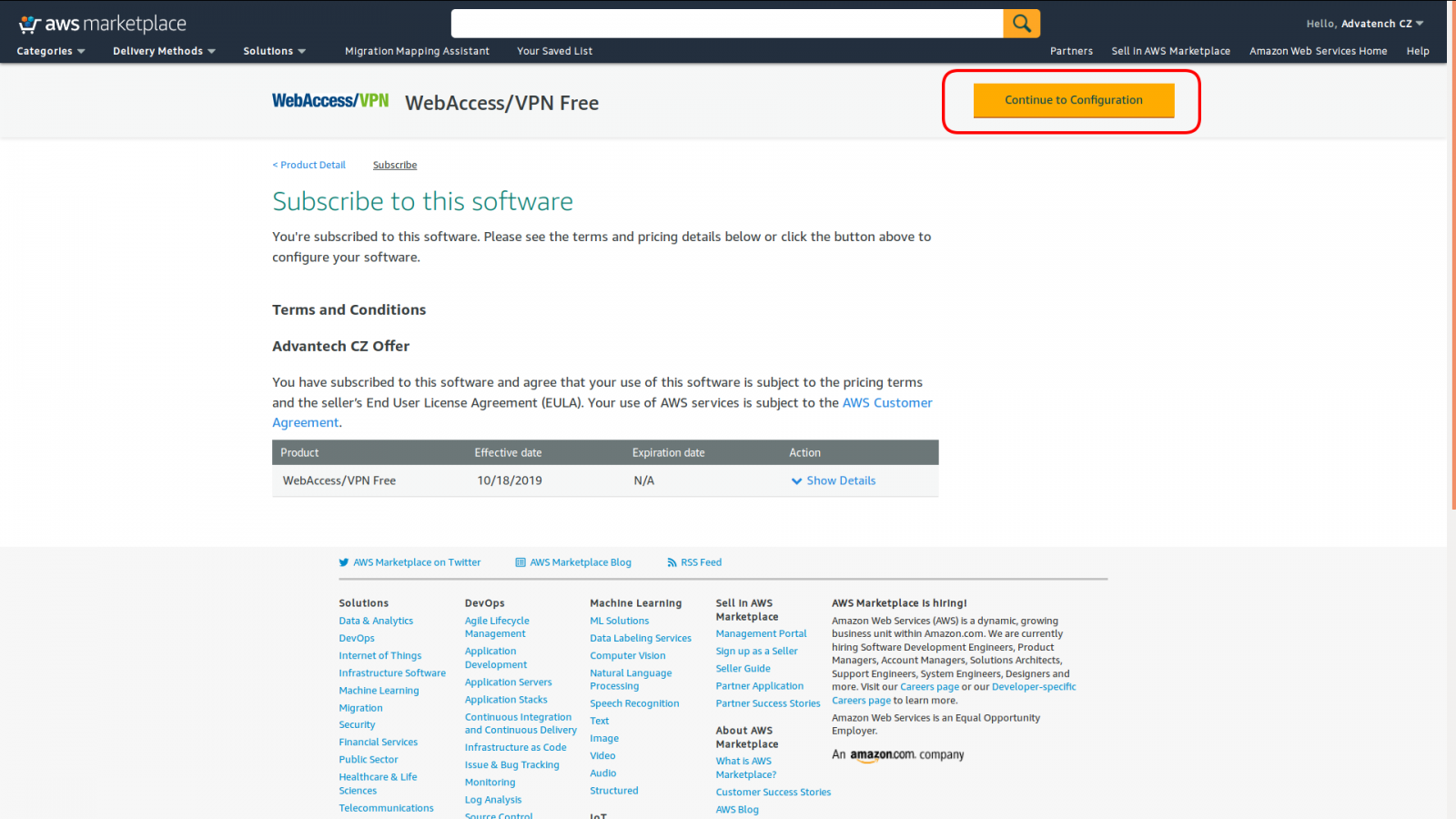 There may be some delay before Amazon processess your acceptation of AWS agreement though it should not take more than a minute. Once the AWS agreement is done, you may continue by clicking on "Continue to configuration" as shown on the next image.