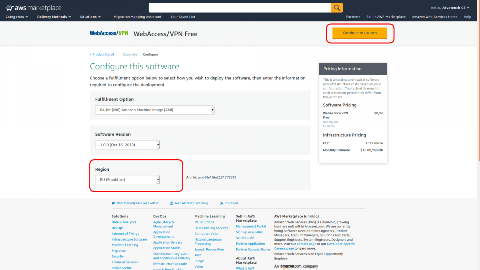 In the next step, you select the Region you want to run the image at and click on "Continue to Launch" as illustrated on screenshot below: