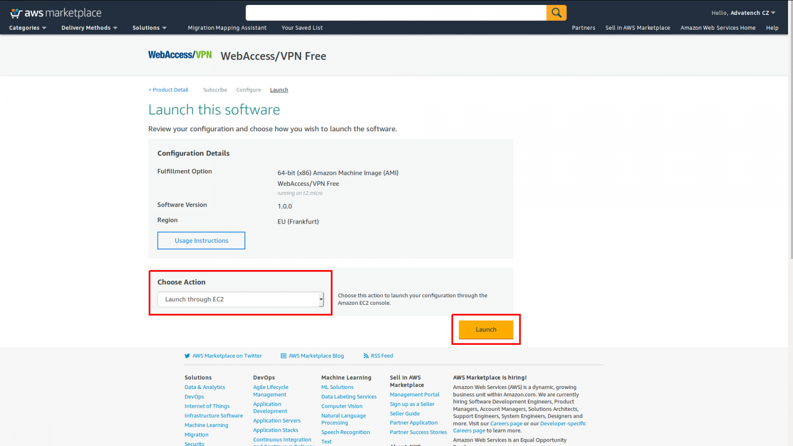 In the next step, you need to select the "Launch through EC2" Action and confirm it by "Launch". Also note that here you can inspect the instructions on proper setup by clicking on "Usage Instructions".