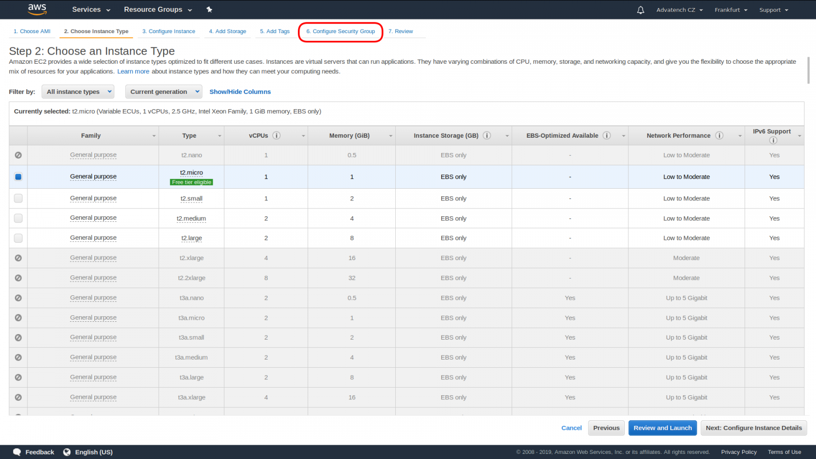The Instance type suggested in next step, t2.micro, is quite okay for running the Free version of the product (in fact, it is sufficient for production use as well while the number of routers stays low). But because the routers need to be able to connect to the server, you need to configure the so-called Security Groups. Therefore, click on "6. Configure Security Group" as shown in the next picture: