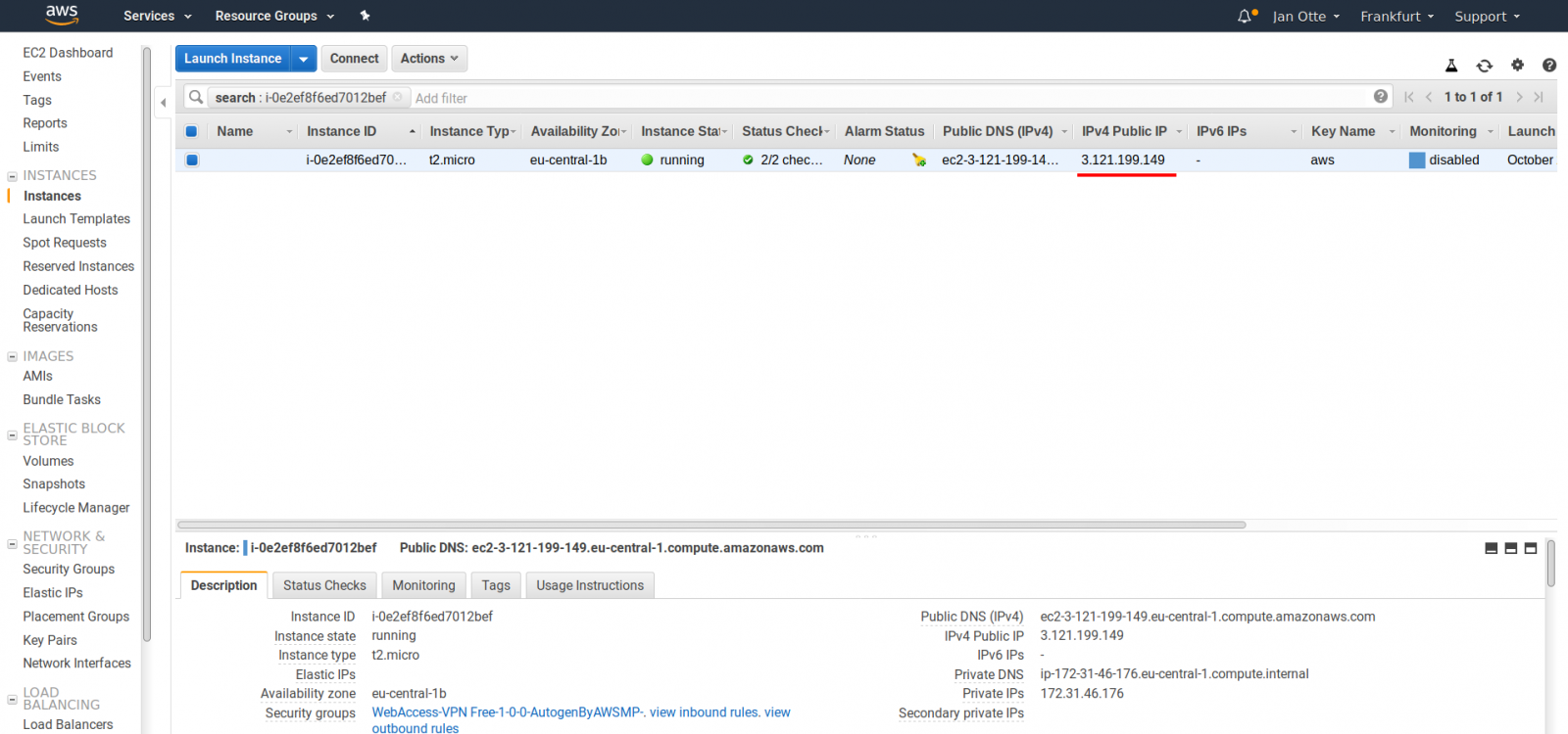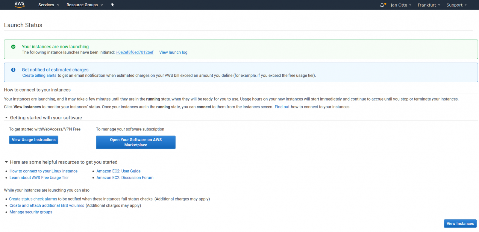 Once the instance is launched you will be redirected to "Launch Status" page. From here you could continue by clicking on the first link (the alphanumerical instance identifier) or View Instances on bottom right.