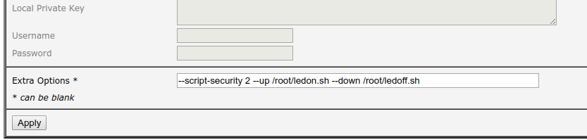 --script-security 2 --up /root/ledon.sh --down /root/ledoff.sh